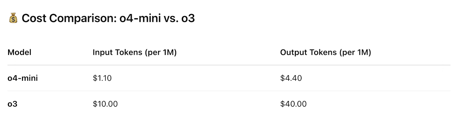 o4-mini: Small, sharp, and surprisingly capableo4-mini is the latest addition to OpenAI's "o-series," its line of reasoning models that are trained to think longer before responding. It's optimized for both quantity and quality (with a daily cap for consumers of 150 messages opposed to o3's weekly cap of 50), offering near o3-level performance—especially in math, coding, and visual-heavy tasks—faster and at a fraction of the cost. While o3 is OpenAI's most powerful reasoning model, o4-mini is your go-to when you want most of o3's smarts for a bill nine times cheaper. That's not a mini difference. Source: o4-mini/Vivian Meng.What it's great at: