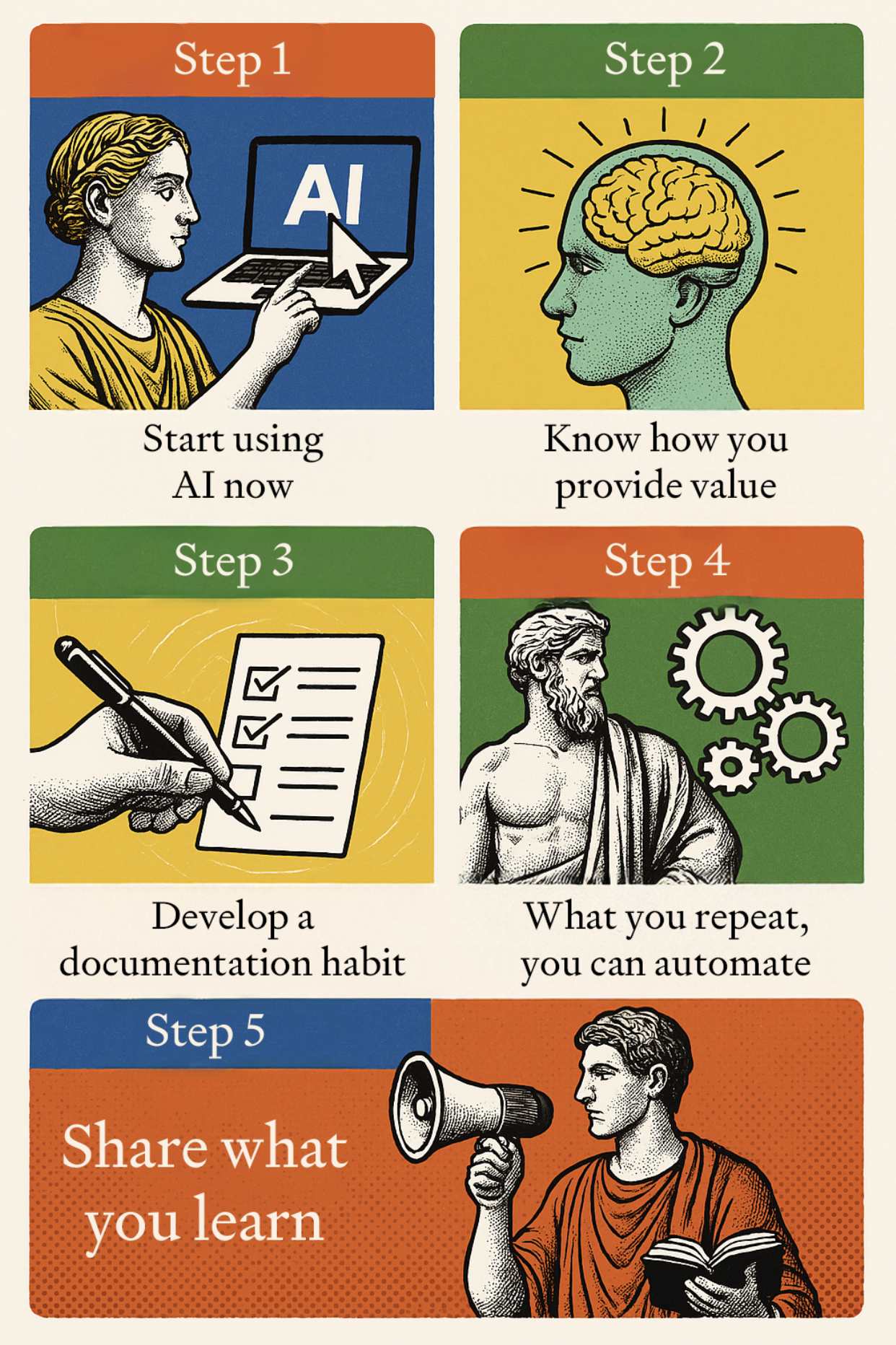 If it worked once, it can work 10 times, and if it works 10 times, it's probably worth sharing—or automating. Just make sure it's worth building according to the value you defined in step two. A common failure mode is experimenting without documenting—you close your chat window before capturing the prompt that worked or the output that was just right. It just takes one more message to ChatGPT to ask it to turn your conversation into a template. Here's an example: "Can you turn this conversation into a reusable template? Include the key instructions I gave you, the structure of the output, and suggestions for how someone else could adapt it to their own use case." Try to answer the question from Lutke's memo: "What would this… look like if autonomous AI agents were already part of the team?" This question is a forcing function for creative problem-solving. The next wave of groundbreaking AI products will come from people who master their domain first and AI second: Think a designer who builds an AI platform that creates an opinionated style guide from a moodboard; an architect whose AI tools follow them from discussions about materials to 3D renders, enabling seamless exploration; a teacher who uses AI as a way to grade spoken Socratic seminars during which the tool could visualize the conversation or nudge the teacher to encourage a shy student to chime in. Your expertise in your actual job is your advantage. You know the problems worth solving because you live them every day. AI is just the new tool in your kit. Step 5: Share what you learnBy now, you're using AI regularly. You have a few automated workflows. You're documenting, experimenting, maybe even prototyping. Now is the time to share what you've learned—not when it's perfect or after you've turned it into a polished tool. In a company in which employees are learning something new at scale, early transparency becomes leadership. When you share what you're trying—even if it's messy—you give your teammates a blueprint, or at the very least, permission to try something themselves. Pick one thing—an AI-powered workflow, a lesson learned, or a prompt that surprised you—and post it in a public Slack or Discord channel. Or run a 15-minute "here's what I tried" session at your next team meeting. It doesn't have to be formal—your goal is to show your process, not just your outcomes. These show-and-tell sessions create vital bridges: The people closest to the problems can explain their needs and solutions, while technical teams can identify opportunities to automate and scale what's working. Sharing your experiments builds trust and visibility. When performance reviews include questions about AI usage (as Lutke says they will), you won't be guessing at answers. You'll have receipts. Learn AI like it's your jobIf you take nothing else from this guide, take this: Your next performance review isn't about whether you used AI. It's about what AI helped you accomplish. Getting started with AI is all about overcoming inertia. That first step feels hard because it's new, but humans are remarkably good at making tools part of our nature. We learned to create symphonies from curved wood and string. We turned crushed rocks into computer chips that became windows into all human knowledge. This is just the latest tool—arguably the most powerful one we've ever made, and one of the easiest to adopt. You don't need to build an agent or master prompt engineering. You just need to start the loop: Try, reflect, document, share, repeat. The people who do that—the ones who start small, learn fast, and make their work visible—are going to define what this AI-powered version of work becomes. Every question you pose to AI, every benchmark you set, every problem you solve shapes how these systems evolve. When you document what "good" looks like, you're training the next generation of AI on what matters. The questions we ask today become the capabilities built tomorrow. Thanks to Katie Parrott for editorial support. Alex Duffy is the consulting lead and a staff writer at Every, where he writes about empowering people with AI tools and technology in Context Window. You can follow him on X at @theheroshep and on LinkedIn, and Every on X at @every and on LinkedIn. We do AI training, adoption, and innovation for companies. Work with us to bring AI into your organization. We also build AI tools for readers like you. Automate repeat writing with Spiral. Organize files automatically with Sparkle. Write something great with Lex. Deliver yourself from email with Cora. Get paid for sharing Every with your friends. Join our referral program. |