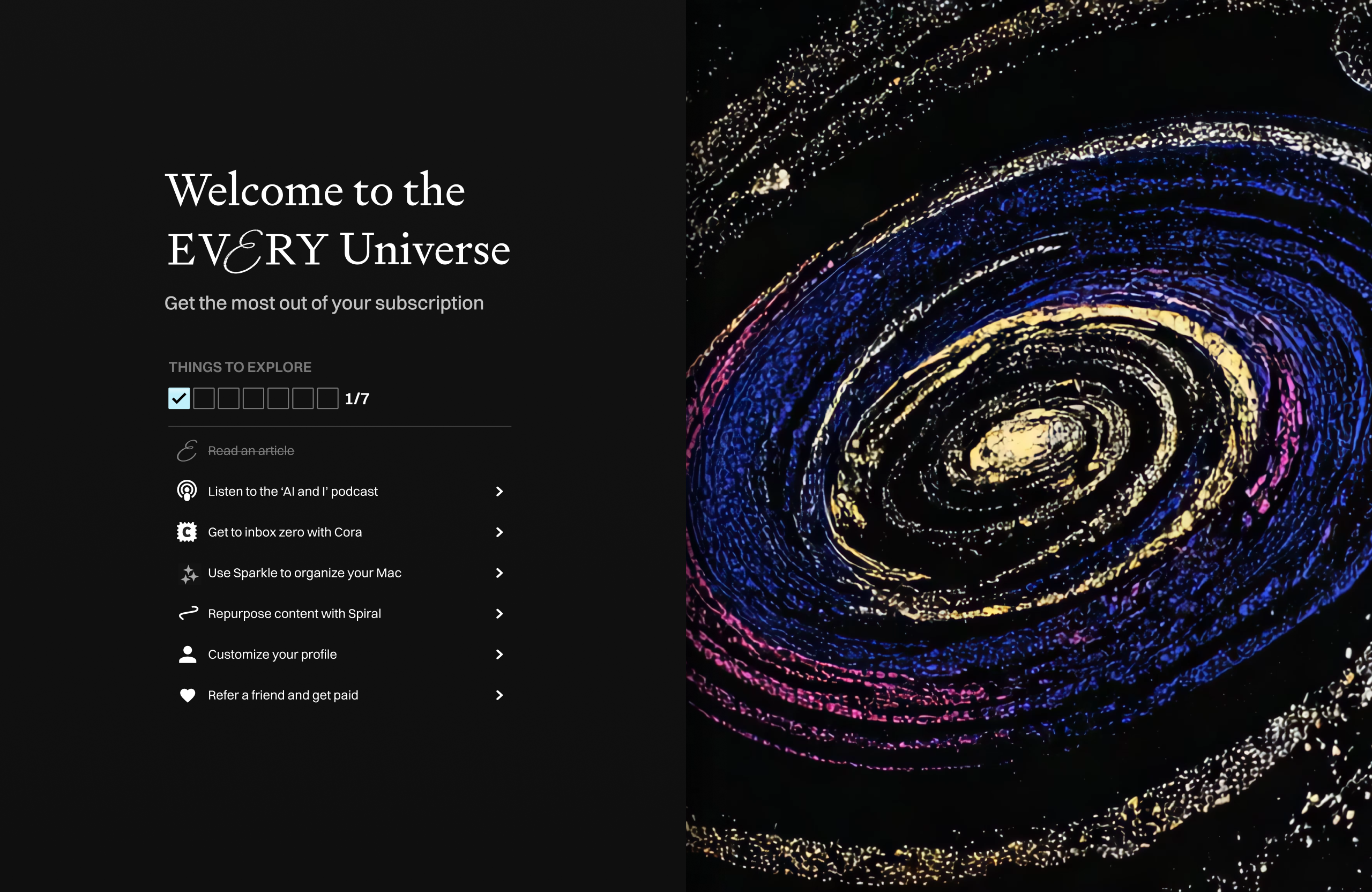 A New Map to Guide You Through the Every-verseEvery started as a newsletter. Somewhere along the way, it became way more.by Vivian Meng Each week in the Sunday edition of Context Window, we publish a roundup of news coming out of our product studio—the team of developers and entrepreneurs in residence building software with AI. This week we're trying something new and publishing our Studio news as a standalone newsletter. We hope you find it useful—let us know what you think in the comments.—Kate Lee Was this newsletter forwarded to you? Sign up to get it in your inbox. What began with a newsletter—mere words on a screen—has grown into its own small universe. A starry sky, full of essays, stretching to the horizon. AI apps that cluster into a constellation we call our Studio. A private Discord orbiting in the background, reader conversations igniting like stars in a nebula. Each week our show AI & I streaks across the internet's podcasting firmament. You get the idea Here's the thing, though—we've been conducting surveys with readers like you, and we discovered something curious. When someone new subscribes, they often don't realize the cosmic cornucopia they've just stumbled into. Take our apps, for example: Sparkle, Cora, and Spiral. You get premium access to them with your subscription. But then what? What do they do? It's like being handed the keys to a spaceship without a manual. So our growth lead, Victor Stepanov, has crafted something essential: a checklist. Think of it as a guide to Every's cosmos—a star chart to understand what you now have access to, and to make the most of your journey with us. What excites us most about this is that it's just the beginning. We can see this simple checklist evolving one day into something more personalized and interactive. Imagine it learning your interests, adapting to your Every journey, becoming less of a static map and more of a living guide that grows with you. The early signs are promising. New subscribers who've started using the checklist since launching two days ago are crossing off at least one or two items almost immediately, discovering more Every products than before. That is what Every has always been about. It's why we pour our hearts into the content and tools we create. We want our creations to form spaces where curiosity can unfold naturally, where each click might lead you somewhere unexpected, where the journey of exploration never really ends. Thanks for being a part of our universe. Vivian Meng is a producer and operator who produces the Every podcast AI & I. You can follow her on X at @vivnettes and on LinkedIn, and Every on X at @every and on LinkedIn. We build AI tools for readers like you. Automate repeat writing with Spiral. Organize files automatically with Sparkle. Deliver yourself from email with Cora. We also do AI training, adoption, and innovation for companies. Work with us to bring AI into your organization. Get paid for sharing Every with your friends. Join our referral program. Get More Out Of Your SubscriptionTry our AI tools for ultimate productivity |
