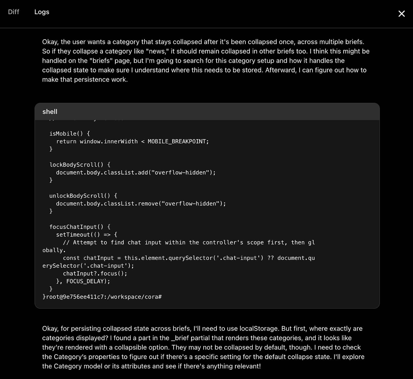 Overall: It's a tool you'll reach for if you're a tech lead adding features or fixing bugs on an existing codebase. If you're trying to vibe code a new one-person billion-dollar SaaS company, look elsewhere. A Codex tourCodex presents you with a simple text box that asks you to describe the programming task you want it to perform, followed by two buttons: "Ask" and "Code": This is a telling user interface. It's not a chat box, like ChatGPT, where you can casually go back and forth. Instead, it's a text box for you to type in your well-specified coding task for it to complete. When you press "Code," this screen doesn't disappear. Most other agent products open up a new window for you to watch the agent do its work. Instead, Codex slides your piping-hot new job into its task queue and blinks status updates as it gets going. If you click into the task as it's running, you can see a detailed log of what it's thinking as it's working: For each new task, it spins up your codebase in its own sandboxed environment in which it can run tests and linters—aka spell check for programmers—so it can catch errors itself. Unlike Devin, it does not yet have access to a browser where it can use the code it's written to see if it does what it's supposed to do. When it's finished, it'll give you a concise summary of what it did along with a code diff so you can see exactly what changes it made. It also has a button for you to easily submit its changes as a pull request on Github: What makes Codex differentCodex is OpenAI's attempt to turn o3 into a senior software engineer... Become a paid subscriber to Every to unlock the rest of this piece and learn about how Codex: