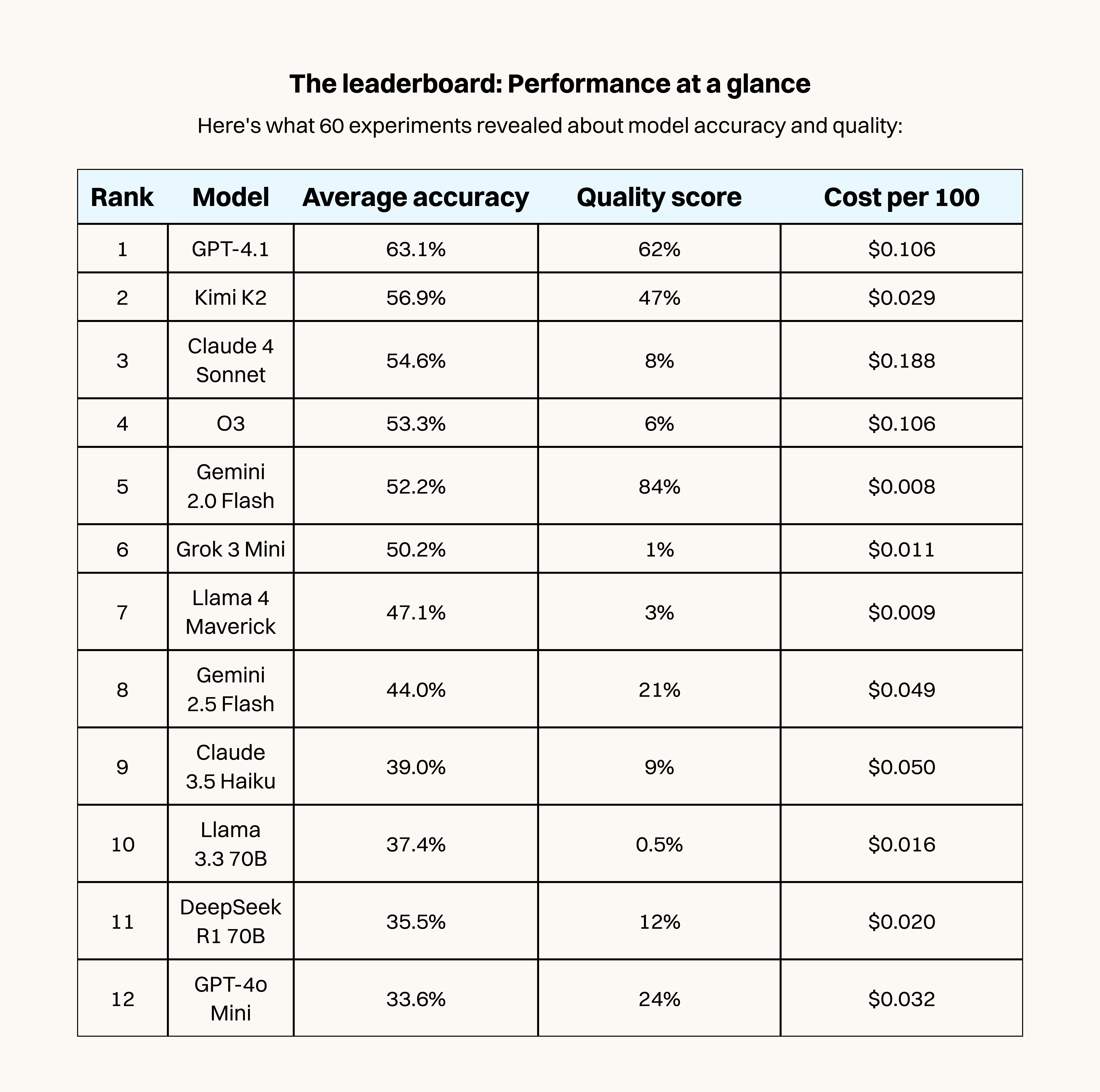 Spending smartAfter 60 experiments, the message is clear: Don't assume expensive means better. Kimi K2 delivers premium performance at budget prices. Gemini 2.0 Flash creates the most human-like responses for less than a penny. Even GPT-4.1, despite my initial skepticism, proves its worth with consistent accuracy. For AI-powered market research, these results change the economics entirely. You can achieve 70-80 percent accuracy at a fraction of traditional research costs. The tools exist today—you just need to know which ones to use. Note on methodology: The five real-world studies we used were as follows (percentages are an average of the 12 models' performance):