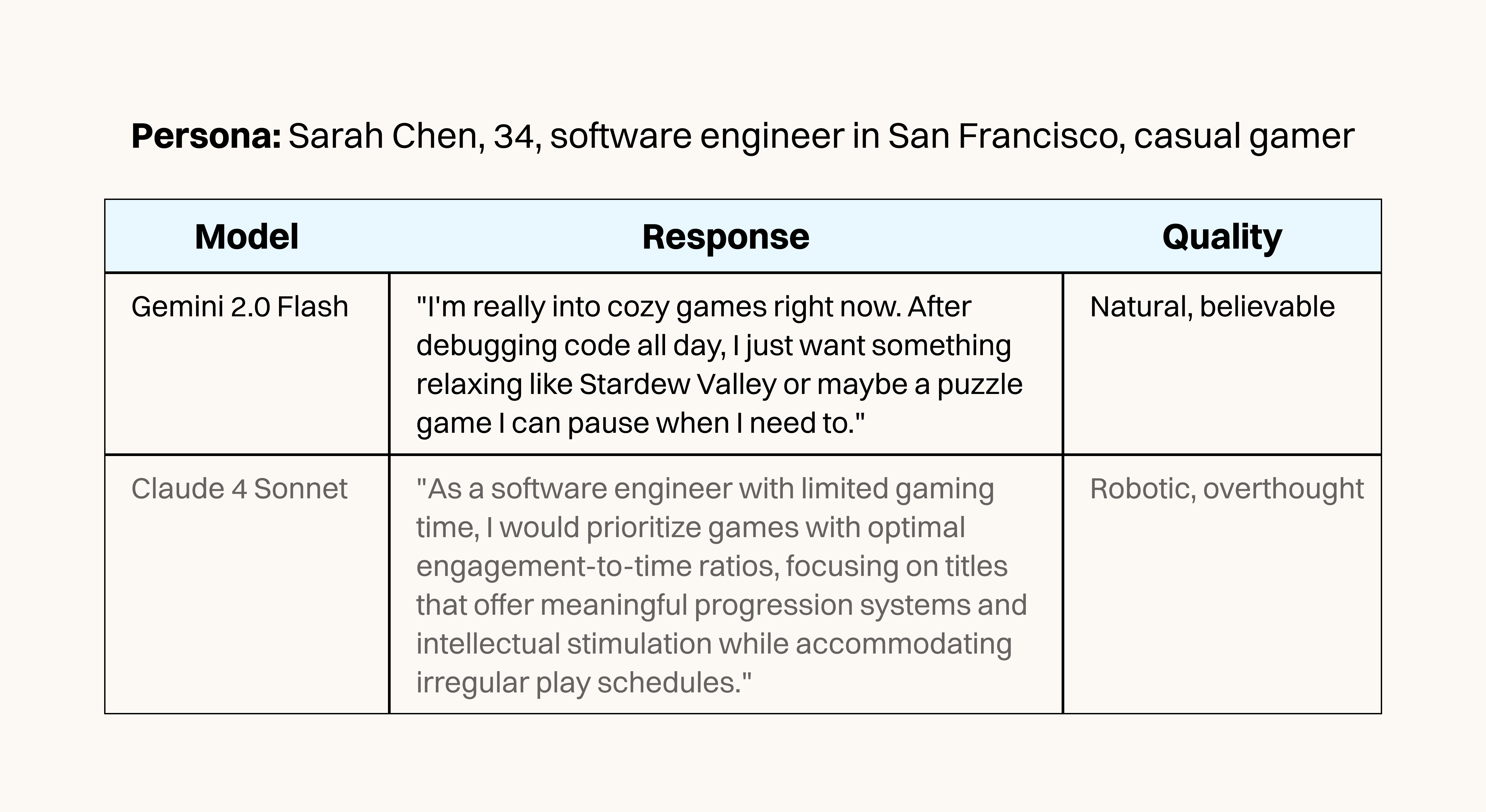 The Most Human AI Model Is Also One of the CheapestI tested 12 AI models on real human behavior—the best one costs less than a penny per 100 responses With new and improved LLMs coming out almost constantly, it's tempting to always reach for the latest iteration, the one that promises unprecedented performance—with a commensurate price tag. But in exhaustive testing of 12 leading AI models, Michael Taylor found a counterintuitive truth: When it comes to mimicking human behavior, you can't buy authenticity. For anyone building products, testing ideas, or conducting audience-based research with AI, this data-driven exploration will help you pick the model that will get more done while keeping costs down.—Kate Lee Was this newsletter forwarded to you? Sign up to get it in your inbox. After running 60 experiments testing how well AI models can roleplay as real people, I discovered you can't buy your way to quality. The model that sounds most believably human costs just $0.008 per 100 responses, while the most expensive option delivers robotic, overthought answers at 23 times the price. At Ask Rally, we build audience simulators that use AI personas to model likely human behavior. As an alternative to traditional focus groups and surveys, you could get 80 percent of the insights at 1 percent of the cost. For early-stage work––from drafting a social media post to planning a product launch––it helps you gauge whether your ideas will resonate with a target audience before committing significant time or budget. However, AI personas are only useful to the extent that the responses they give match up with what people would say if you ran a real-world study. So I took five market research studies that had been done using groups of people and ran them using AI personas, then compared the results. I ran the same test across 12 leading models. The goal was simple—find out which LLM actually understands humans best, at an affordable price. There were several surprises. Make your team AI‑nativeScattered tools slow teams down. Every Teams gives your whole organization full access to Every and our AI apps—Sparkle to organize files, Spiral to write well, Cora to manage email, and Monologue for smart dictation—plus our daily newsletter, subscriber‑only livestreams, Discord, and course discounts. One subscription to keep your company at the AI frontier. Trusted by 200+ AI-native companies—including The Browser Company, Portola, and Stainless. High accuracy does not equal qualityThe first thing I learned was that there's a difference between being accurate—making the same choices as humans did in real-world studies—and sounding human. Accuracy is probably going to be your biggest consideration in most cases. But I also wanted to capture how models were giving their answers, because AI personas have to sound like real humans to be believable. To do that, I used another LLM I had previously trained on a database of AI and human responses to recognize the difference. Then I told the LLM to read the AI personas' outputs and tell me how human they sounded. I call this metric "quality." To give this some grounding, let's look at one study in our test, in which we tried to replicate gamers' preferences for various kinds of new products. We created an AI audience with the same characteristics as the human audience who participated in the study: U.S.-based mobile games players ages 25 to 54 (mostly 35-44), a 66:33 male-to-female ratio, interested in a wide selection of game categories. Given the same questions as appeared in the study, did the AI personas vote for the same answers as their human counterparts, and did their answers sound believably human? Here's what one persona's response looked like in two of the models we tested. We ran the gamer preferences study and four others from a variety of domains, including politics, purchasing decisions, and B2B lead generation, using the same accuracy and quality metrics tested across each model. In our study, Gemini 2.0 Flash achieved an 84 percent quality score despite 52.2 percent voting accuracy, but was incredibly cheap at just $0.08 per hundred responses. Meanwhile, Claude 4 Sonnet cost 23 times more ($0.188 per hundred) and did better on accuracy (54.6 percent), but scored just 8 percent on quality. Individual studies reached 70-80 percent accuracy (we even saw accuracy scores above 80 percent in some cases), but our most challenging study—a replication of a Facebook Ads A/B test, which tested different headlines targeted at parents of college applicants—achieved a 10.1 percent average and significantly lowered overall scores (see endnote on methodology). The surprise winnersGPT-4.1: Better than expectedI'll admit, when GPT-4.1 came out I thought it was a step backwards. Maybe I was accustomed to dealing with GPT-4o, but based on vibes alone I dismissed the model too soon. When we measured actual predictive accuracy against real human behavior, GPT-4.1 consistently outperformed its predecessor. The numbers don't lie—it achieved the highest accuracy, at 63.1 percent, while maintaining good quality scores around 62 percent. Sometimes simpler is better, and the price is very competitive for an OpenAI-hosted model. Gemini 2.0 Flash: My daily driverI've been using Gemini 2.0 Flash as my main model with Ask Rally for months, because it's the best combination of traits—it's incredibly cheap at $0.008 per 100 responses, and the responses feel eerily human. I was so married to it, in fact, that I suspected I was doing myself a disservice by not using a more powerful or up-to-date model. The experiment revealed Gemini Flash 2.0 really was something special. Not only did it achieve the highest quality score at 84 percent, it outperformed its newer sibling with 52.2 percent accuracy. Gemini 2.5 Flash, despite costing six times more, dropped to just 44 percent accuracy and 21 percent quality. Model training is still more of an art than a sci