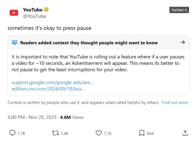 | | | | Oops! YouTube tweeted "it's okay to press pause," which sparked fury from users who linked it to the platform's annoying pause-screen ads | YouTube's social media managers probably only wanted to promote mindfulness, but the replies on perma-angry X were filled with mockery, calling out YouTube's ad practices and Premium paywall. | The tweet was ratioed so badly it earned a Community Note correcting its interpretation. 😬 | | More fails: | |