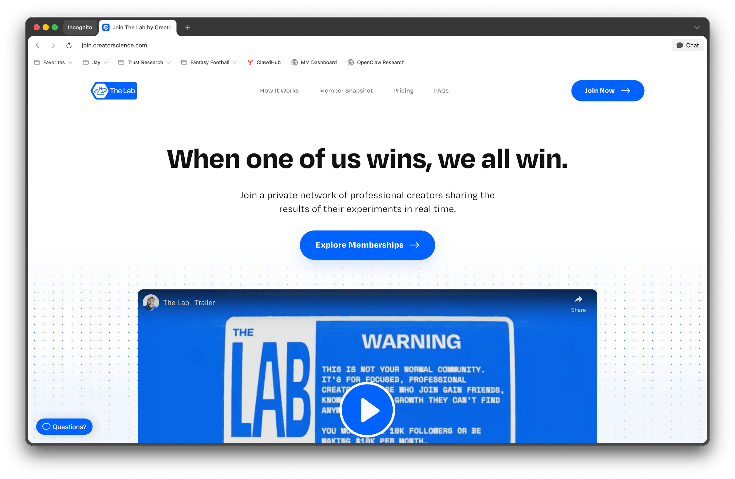 This page perfectly encapsulates the vibe, legitimacy, brand, and fun we have in the community. Andrew Ellis developed the trailer you'll see at the top of the page, Martin Cris designed the page, and Hollie Arnett developed the brand as a whole. All three are members of The Lab and incredible creatives who helped really bring this to life.