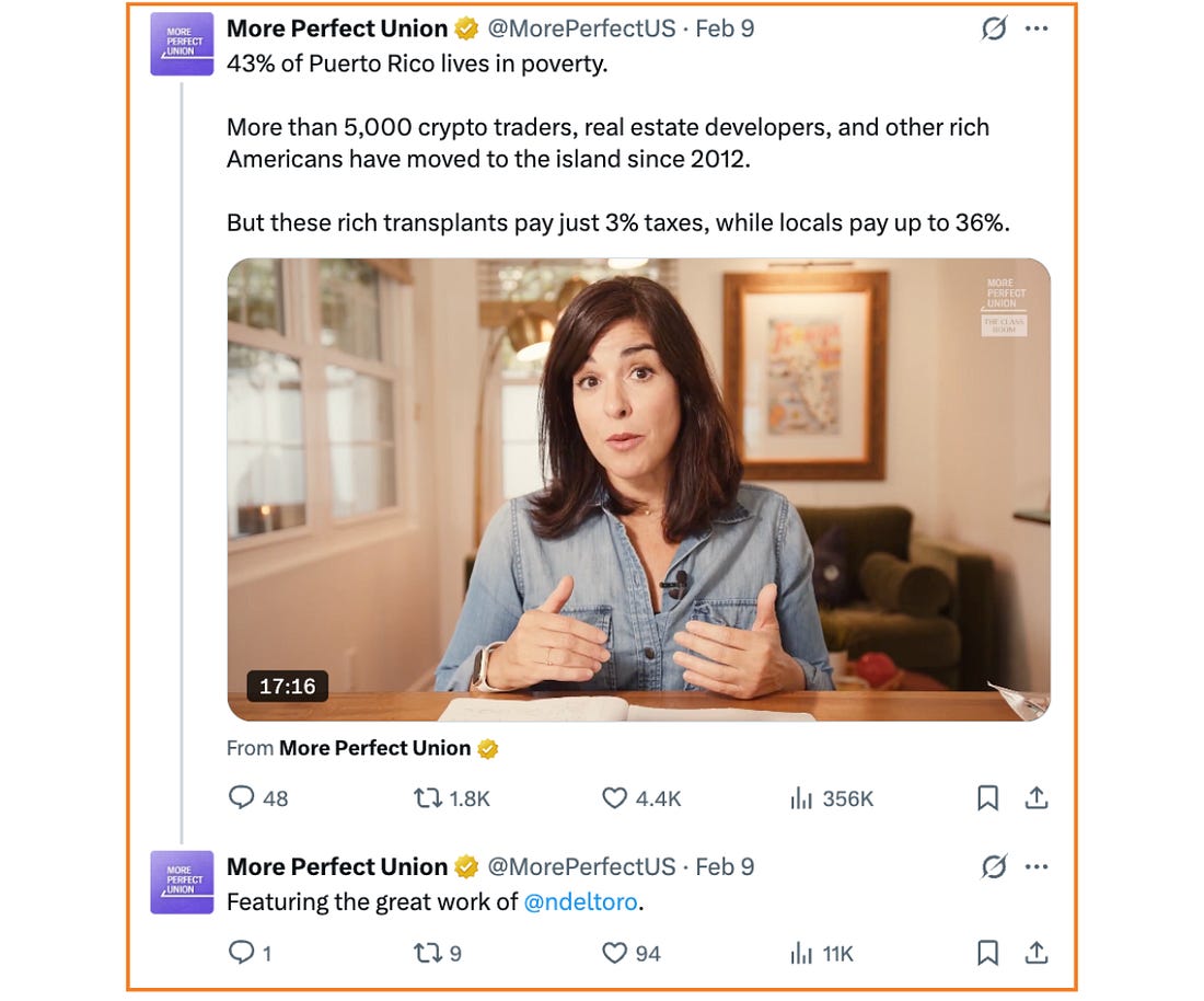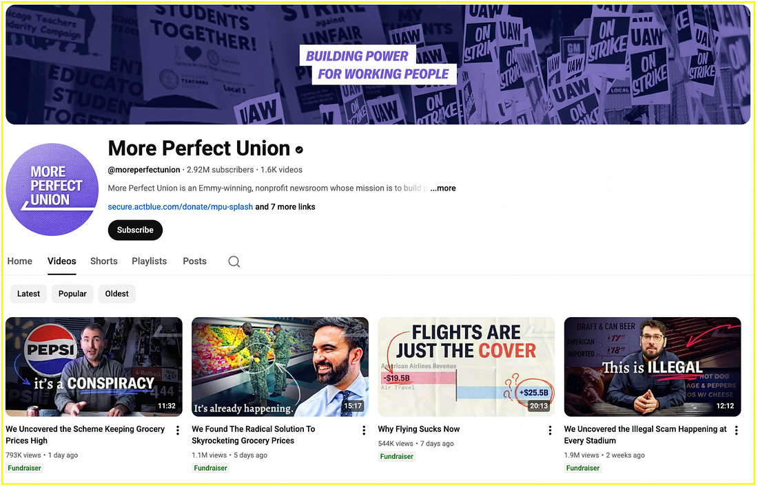 I sometimes wonder if we’ve over-indexed on what it looks like to be “social first”. Five years ago, it felt like a mandate: iPhone only, trends break through, attention at all costs. What have we lost? I understand that engagement—specifically shares and watch time—are signals that help a piece of content perform better. It’s a non-negotiable if you want to be seen. But I worry that we’ve slowly boiled out substance in search of performance. The sugar high of a trend feels good, but I have a feeling audiences want something more to chew on. Attention doesn’t always tell the full story of resonance. Of course, this isn’t true across the board. Plenty of accounts have been doing a great job at this. It’s hard work. One of those accounts is More Perfect Union, the nonprofit newsroom dedicated to building power for working people. They are one of the fastest growing partisan-leaning YouTube channels, according to Kyle Tharp, author of Chaotic Era. Their posts, like this investigation into stadium prices and this carousel on the median age of homebuyers being 59 years-old, regularly go viral. When I ask myself—What social media content has moved me lately?—their posts come to mind. In today’s newsletter, I talked to Georgia Parke, Director of Audience Engagement at More Perfect Union. She oversees all of their day-to-day social media content, vertical video program, and distribution strategy for long-form videos. Her background is in politics—starting her career as a press intern for Bernie Sanders in his DC Senate office and eventually leading the social media and design team for his 2020 presidential campaign. We talk about how carousels contribute to follower growth, the role Shorts have played in their YouTube success, and why you can’t just rely on “fueling outrage to activate your audience”. Inside More Perfect Union’s social media strategyRachel Karten: If you had to sum up More Perfect Union‘s social media philosophy, what would it be? Georgia Parke: Build power for working people by producing substantive, informative content that can have real impact. Our audience is smart, informed, and desires substantive news content that relates to their lives—not to be patronized or told that everything is great when it obviously isn’t. My personal philosophy is also to give yourself as much room and permission as possible to be in the moment and responsive to news. I’m very resistant to making content schedules too far in advance or trying to make posts overly polished. On the Bernie campaign, we would joke that the more time we put into making a post, the less likely it would perform well. You should have high standards, yes, but not set so many rules for yourself that you waste time trying to follow them all. RK: What really stands out to me about More Perfect Union is how you show up in truly platform-first ways. The Twitter presence feels different from the Instagram presence—you meet people where they are. Which platforms do you consider your priority platforms? GP: More Perfect Union started out with a very YouTube-centric strategy, and a lot of our work is still focused on that audience. It’s our largest account by far at nearly 3M subscribers, and we’ve added more than half of those in the past year. Right now we’re very focused on building up our Instagram and TikTok in a similar way, with their own strategies and personalities that connect best with the people following us there. Our journalism and social content runs on several different timelines. We do mini documentaries that are produced over weeks or months; create vertical videos with on-the-ground reporting produced in days; and engage with news on a daily or hourly basis. But the common thread among all is relevance and substance. No matter what platform something goes on or how long it takes to produce, it needs to be relevant to the current moment and our audience, and it needs to give people some substantive information or storytelling. RK: Researcher Kyle Tharp recently published a chart showing that More Perfect Union was one of the fastest growing partisan-leaning YouTube channels in 2025. What do you attribute that growth to? GP: Our team produced over 100 incredible long-form videos last year that covered everything from why skiing has become a terrible experience to talking to Trump voters with Bernie Sanders in West Virginia. We also went all-in on producing vertical videos a year ago, and that drove fantastic growth on YouTube. In 2025, we had nearly as many views coming from Shorts as we did from our regular channel videos. But separately from any particular tactic or format: I think many people are eager to see journalism and social media content that tells the news through a working class lens, about the labor movement, the economy, corporate accountability, political corruption, and more. I think a lot of people find our content refreshing and unique, and can see themselves represented in stories about working people speaking on the realities of the current economy. RK: Can you share an example of a long form YouTube video that you cut down into a successful short form video? What sort of things do you keep in mind when converting long form to short form? GP: We try to produce cut-downs that don’t necessarily condense the full video but pull out a compelling piece of it. We’re also not trying to leave you hanging or drive you to our site; we want you to get a full piece of compelling info even if you only watch for a minute or two. For example, this video about the impacts of a Meta data center was cut into this clip focusing on one of the individuals in that story. It’s our most-viewed Short ever and led to Meta reaching out to the affected person directly. RK: I also recently covered your Instagram carousel strategy in the newsletter. They are really great! Can you talk to me about your approach to carousels and some of the success you’ve seen from p