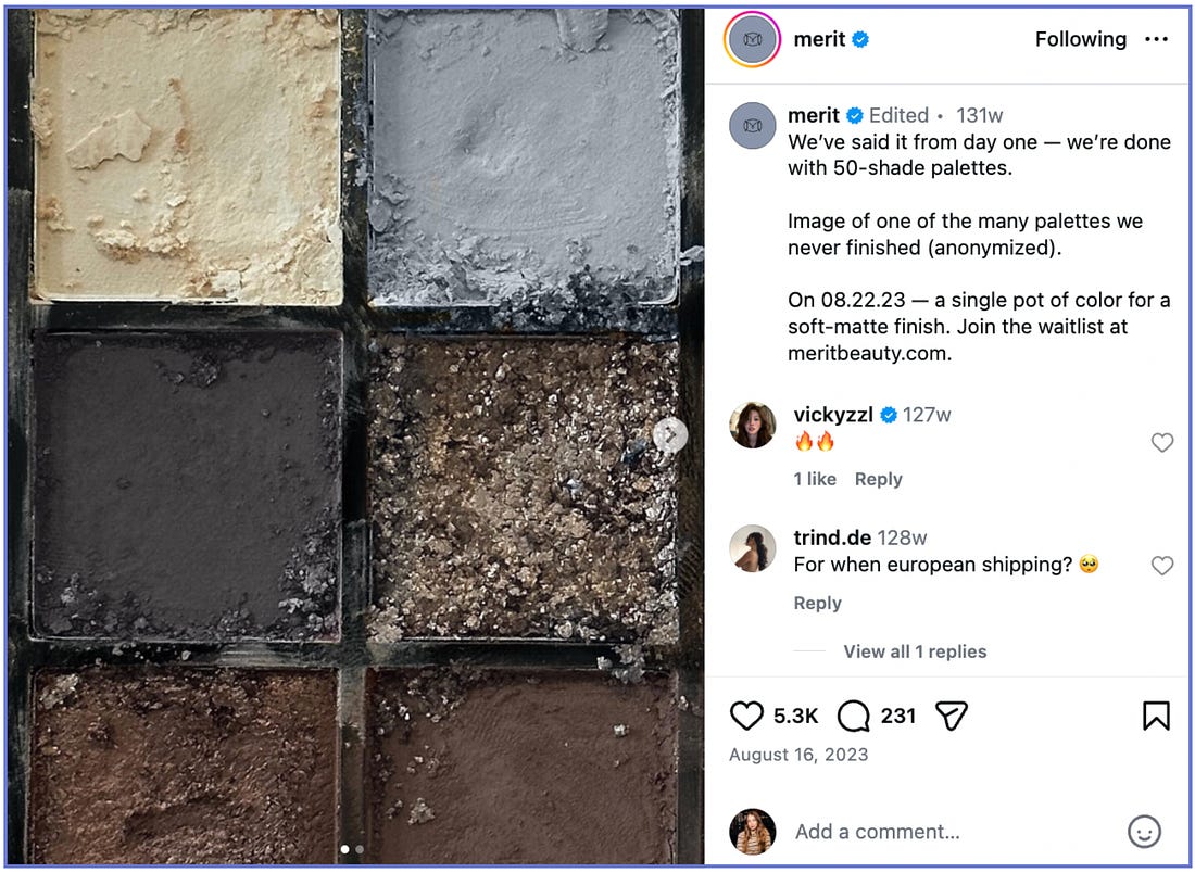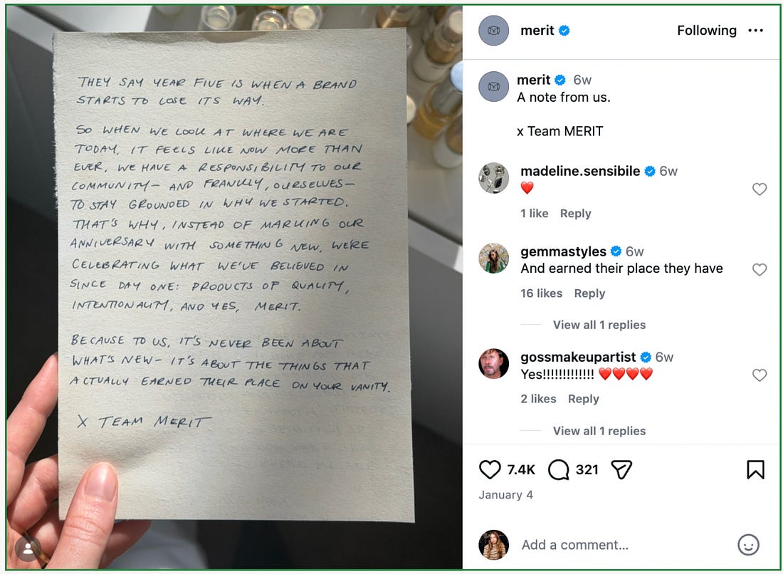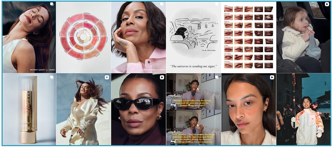 This interview has been edited for length and clarity. Rachel Karten: I’ve joked before in this newsletter that I don’t interview CMOs. But through reading interviews and talking to people on your team, I get the sense that you really understand this world. In your role right now as CMO, what is your relationship with social media? Aila Morin: I think what’s quite different for me is that my career started when these platforms were coming out. I was coordinating influencer marketing deals off of YouTube before there was even Instagram. When Instagram launched, I started doing social marketing. I had the fortune and the timing to start my career at a time when all of these platforms were coming out. When Merit launched five years ago, I did all of the social. For me, not only is the work not far away but it’s also formative to how I was taught marketing in the first place. To this day, I am in every single social review. I don’t believe the delusion that social media is done by one manager, which I think is one of the most damaging things that executives believe about social media. We invest in it. We take the time to really think about how a story rolls out. We guide campaigns off of social instead of retrofitting it into social. RK: When you zoom out to marketing as a whole—what would you say your philosophy is? AM: For the last 15 years, marketing got diluted to a funnel that we all know doesn’t work. But it was a philosophy of CPM views into CPCs into traffic into conversion. Everybody forgot about sentiment and retention, which is actually so much more important than your funnel can ever be. My philosophy is very much focused on telling tangible stories that people remember and that evoke emotion because then it’ll have a positive sentiment. It’s very simple and streamlined, but if everything doesn’t come from that and doesn’t come from building something from a position of a pain point and fixing a problem and telling the story around that problem, then it’s not marketing. You can see a photo without product in it and know that it’s Merit because we built a brand, not just product marketing. It’s something that a lot of brands are still missing today because they think that every single post needs to drive revenue immediately. RK: Obviously I look at social media for a living, but it feels notable how I am able to recall Merit posts from years ago. The Solo Shadow thesis video comes to mind. They stick in a way that a lot of brands aren’t able to accomplish. What role does resonance play in your strategy? AM: Merit develops product in a not-so-linear way. We actually develop campaigns before we even develop a product. To use Solo Shadow as an example, the thesis existed before the product existed. I knew what we were going to say. I knew what the product had to do. The video from this campaign, where we read the thesis out loud, wasn’t actually planned. We had our whole campaign ready and then a retailer told us that they were going to launch 10 other eyeshadows on the same day as us. So we had planned this entire campaign around Solo Eyeshadows and we were being launched in an animation featuring palettes. We had never made that internal-facing thesis public before but we felt we had to say the why so it’s clear what the intention was behind this new product. That ended up becoming a step change in our marketing because it was the first time that we had publicly put forward the why or the problem that we’re solving. I would also say that we didn’t design that to go viral, nor do we design any of our content to go viral. We’ve done many similar videos since that have not gone viral. It’s always a mix of timing and sentiment and what else is going on in the world. We used to try participating in TikTok trends. My theory though is that why would you even want that to be the content that goes viral? Because it’s probably not the best representation of your brand. And is that what you want people to remember? Not only are we not fast enough for it—nor are we very good at it, to be honest—it’s never really driven anything for us that’s been of value. That viral video is actually the only one that I think drove value for us because it also was about the brand ethos. RK: You’ve talked about this concept of being relevant and rooted in previous interviews. What does that mean to you? AM: I think brands spend a lot of time talking to themselves or looking at what other brands are doing. Rooted for us means marketing in a way that is honest to the brand and coming at it from a direction that hasn’t been done 50,000 times. I also don’t keep social media on my phone and that is a very intentional decision. Relevant means that it serves a purpose in people’s lives. Otherwise, why do I care? A post should either fundamentally trigger an emotion—with Whitney on the trampoline, we’re not selling a product, we’re selling a feeling. Or a post should sell a product—show the shades and the lineup, explain what it does, explain why it’s valuable. Ultimately every post needs to have a purpose. I think so often you’ll see people post content because they’re still thinking in a grid. That era of social media is dead because people don’t consume like that. We’ve just gotten so much more focused on high-value content. We are posting a lot less. We were posting every day on Instagram. We’re now down to every other day, because you can’t expect teams to create 365 days a year of perfect content. It’s not realistic. We focus much more on quality engagement instead of quantity of posts that go out. RK: Something I’ve been circling recently is this idea of a brand respecting their audience’s attention. Treating them like they are intelligent. Merit does a good job at this. AM: It’s such a small thing, but we’re very clear on what we are and what we’re not. Right? Merit’s core consumer is Millennial and Gen X. We are 30