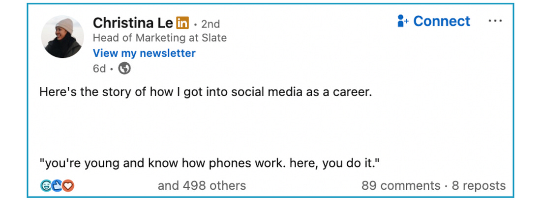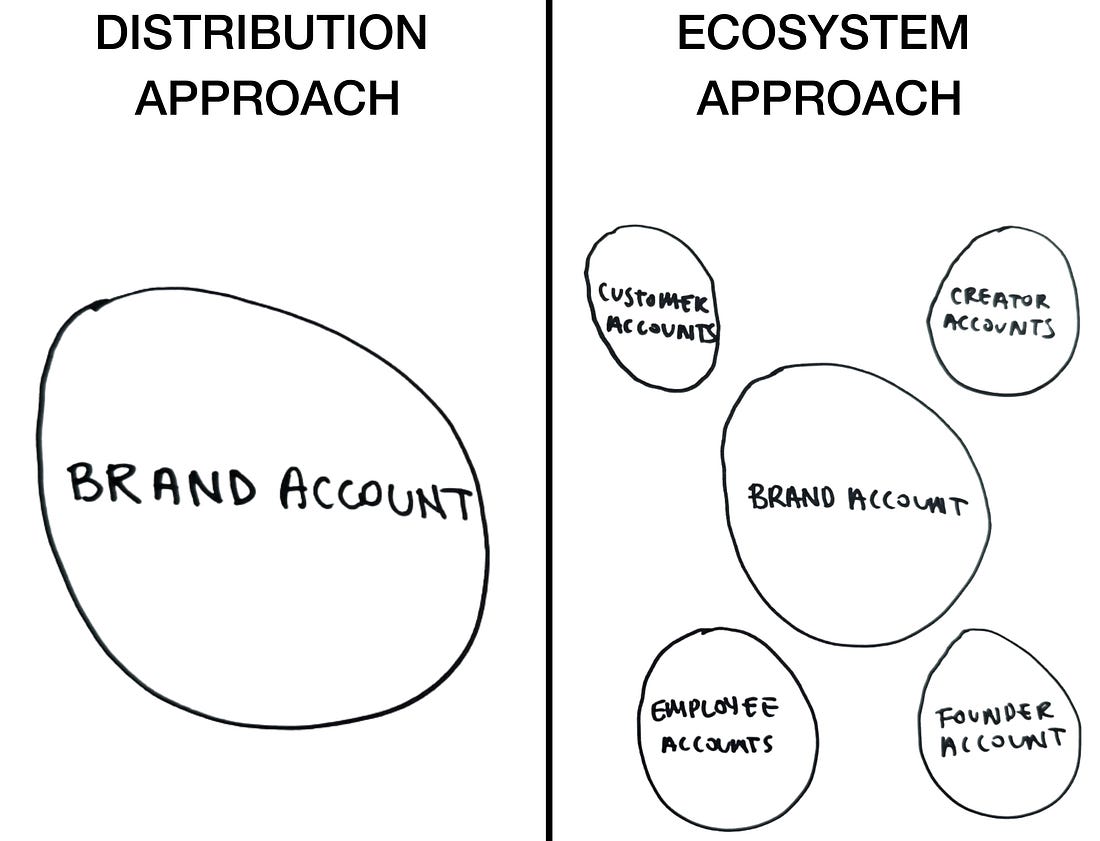 Today’s newsletter is sponsored by Slate, the content creation platform made for social teams. Part of being a good social media professional is knowing your blind spots. B2B marketing is my blind spot. I have only ever worked for consumer-facing companies. I know how to show up on LinkedIn as a person (I have a Top Voice badge!) but brand strategy feels out of my wheelhouse. I know there’s a good amount of you who’d like me to cover the space more. Today, I called in Christina Le, Head of Marketing at Slate, to share her B2B social playbook. She’s spent the past 10 years almost solely working in B2B social. What’s refreshing about her approach is that she views social media not as a distribution channel, but as one big ecosystem. It’s a framework I’ve been circling lately too. She told me, “When we approach our LinkedIn strategy, we don’t think ‘how do we grow the Slate page?’ We think, ‘how do we increase Slate’s surface area on LinkedIn?’” It’s an important distinction. I attempted to sketch out what that looks like in practice below. Christina’s job right now as Head of Marketing is to make sure the Slate story gets out there and that the product is positioned in a way that actually resonates with people who do social media for a living. (Slate is like your favorite video editing app…but for brands.) That story can come to life in so many ways beyond just the official brand account. Below we talk about using people as a distribution engine, why message is more important than format, and the LinkedIn metric she loves to track. Rachel Karten: If you had to sum up your philosophy when it comes to social media, what would it be? RK: Your background is in B2B social. What do you think the biggest difference is between working in B2B social vs B2C social? But in B2B, you’re not just selling a product, you’re selling change inside an organization. That means you’re speaking to practitioners who feel the pain, but you also need decision-makers who control budget. And those aren’t always the same person. So the content has to do two jobs at once. It has to resonate emotionally with the person doing the work, and it has to justify itself strategically to the person signing the contract. That’s why I fully believe that B2B social requires more positioning discipline. You can’t just be entertaining. You have to be useful. You have to build credibility, and be commercially aligned. And candidly, I think B2B social marketers could move into B2C more easily than the reverse. In B2B, you’re constantly balancing. You’ve got the challenge of building a brand and then education, and then there’s revenue pressure. All of which sharpens you. It’s a different game. I mean, there’s much slower buying cycles. More stakeholders. But when it works, it compounds. On other platforms, especially for B2B, you’re competing in a mixed feed. Your buyer, their employees, their cousin, and someone’s grandma are all scrolling the same algorithm. The signal gets diluted. On LinkedIn, I feel like the intent is different. People are there as professionals. They’re using their real identity. They’re thinking about work, growth, hiring, vendors, performance, you name it. You’re not interrupting their downtime outside of work. It’s also one of the few platforms where distribution is still relatively democratic. A strong idea from a practitioner can outrun a polished corporate page. And I feel like for B2B, that combination clear targeting and professional intent plus the organic reach that still works is very powerful. If you know who you’re trying to reach and you’re saying something worth listening to, LinkedIn gives you a straight line to them. When we approach our LinkedIn strategy, we don’t think “how do we grow the Slate page?” We think, “how do we increase Slate’s surface area on LinkedIn?” That age old belief that “people follow people” is true. So we invest in personal brands internally. I wouldn’t call it a traditional advocacy-program because it’s more like, if you want to build your voice, we’ll support you. And because our team actually enjoys this, it compounds. Operationally, we have swim lanes. Christina Pearo owns community and engagement, including how Slate shows up in comments and conversations. Carmen Vicente owns content output and consistency. I own partnerships and external distribution (creators, customers, collaborators, all that). Everyone knows their lane. Things overlap, but one person drives each stream. When we look at everything we do it might look scattered from the outside, but it’s intentional. We decide where reach should come from, then assign ownership. We review goals weekly. We iterate constantly. We’re also a fairly new team, so we’re still calibrating. Thankfully there is zero ego. If something needs help, we say it. Even our cofounder treats LinkedIn like a serious growth lever. That team alignment is what makes the ecosystem work. RK: What types of post formats have you seen work particularly well on LinkedIn? I see people obsess over “carousels are hot right now” or “video gets reach.” That is all so secondary to me. The real question should be, whether this is something your audience actually thinks about? Like, does it feel earned? Format trends also come and go. I think brand operators should focus on saying something specific, and from experience. Good messaging travels. Then layer in customer advocates. Then creators. Then partners. There are more levers than paid ads, I promise. Oh, and don’t quit after three months. LinkedIn rewards consistency and voice. Commit. If your social team wants to see Slate in action, you can request a demo here. The tool is made by social media managers for social media managers. Video and image editing, branding, and collaboration built for how social teams actually work. Thanks for reading! See you next week! You’re currently a fre